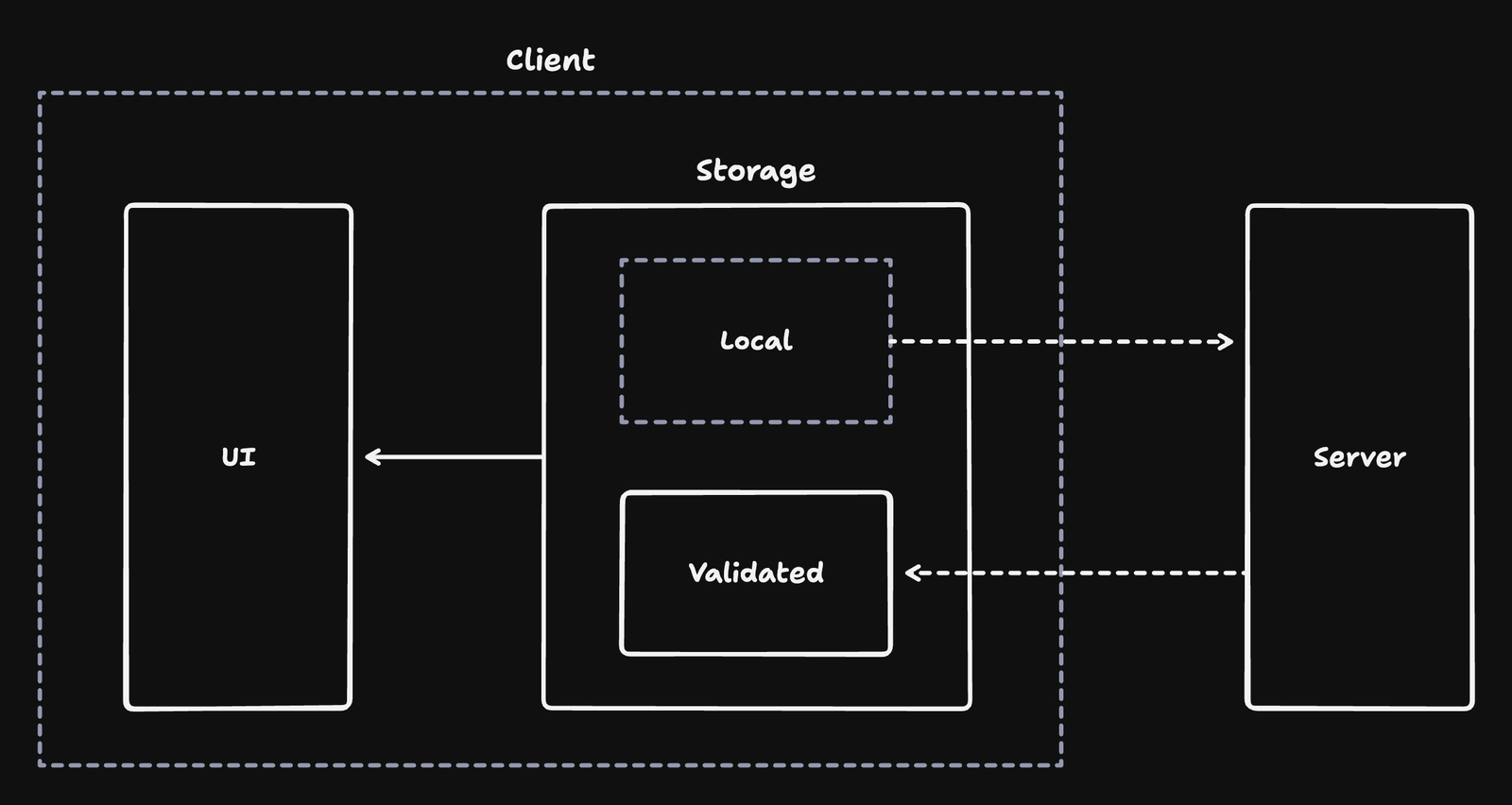 Local changes are applied to the current client, but still unverified. The client can keep making changes even when offline.