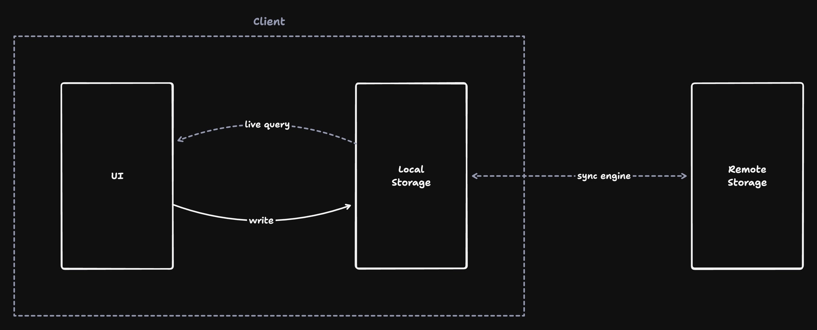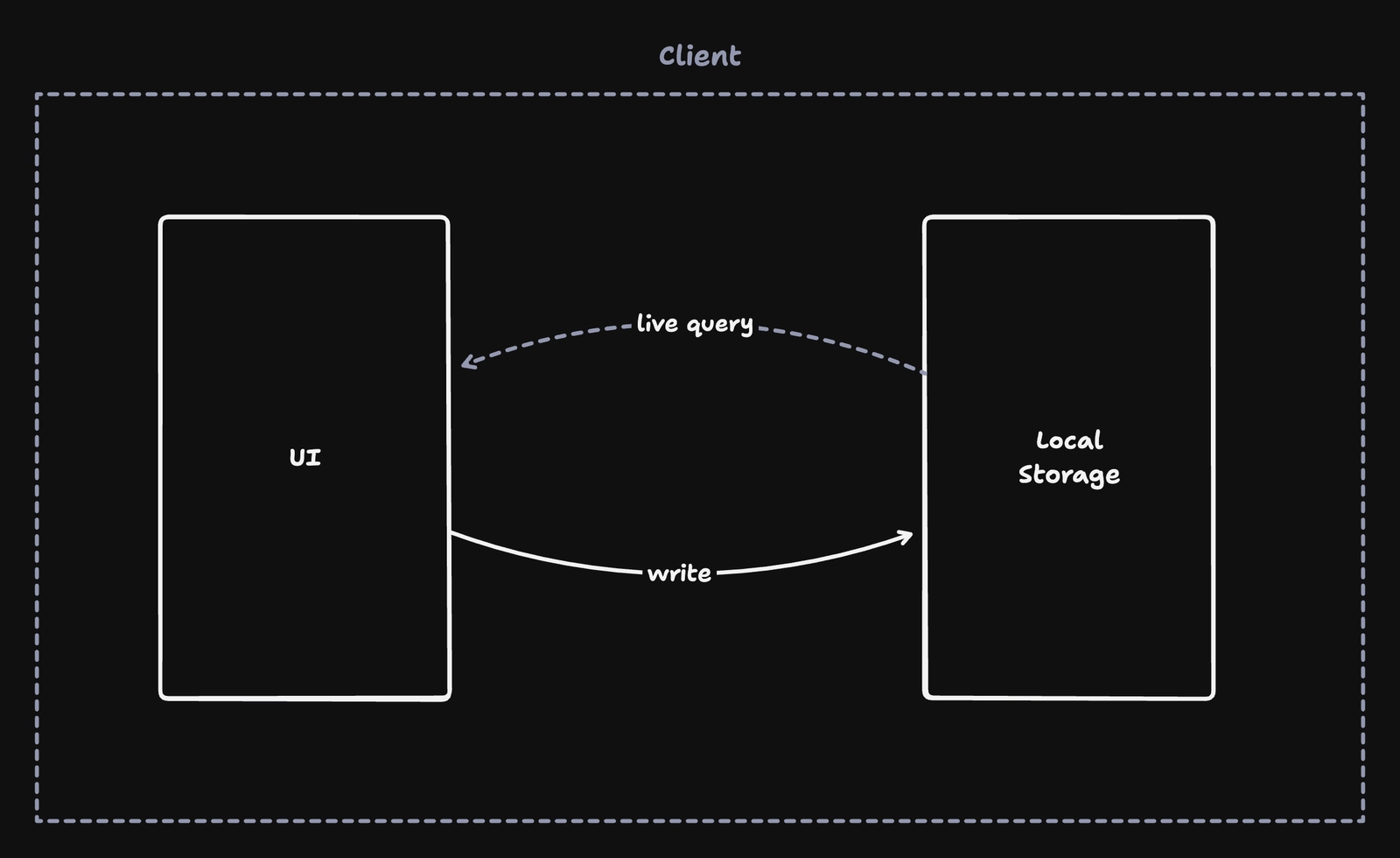 The UI keeps mutating data and using live queries for listening to local data changes: fast, persistent, offline.