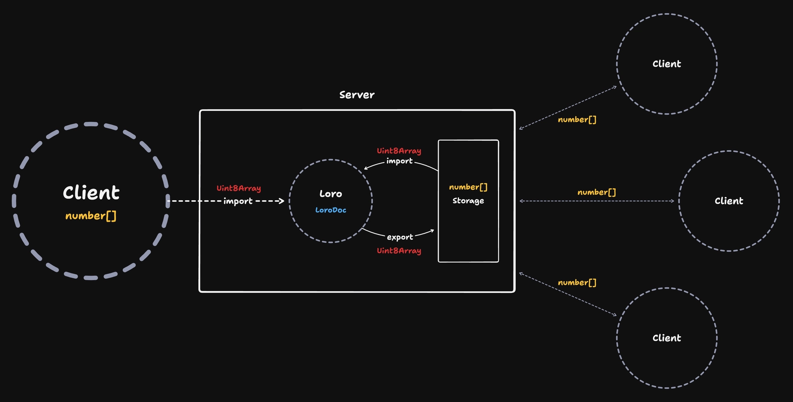 The server stores the Loro CRDT in bytes (number[]). When it receives updates from a client, it can merge them by converting number[] to Uint8Array, Uint8Array to LoroDoc, and then import the new changes into the current value from storage.