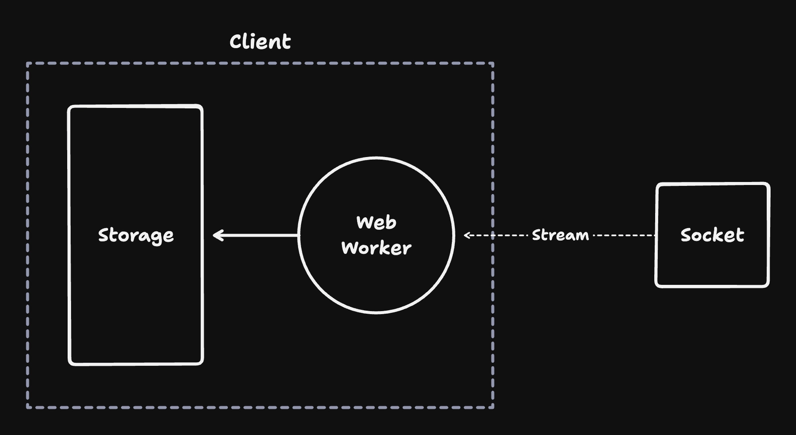 The Web Worker receives a Stream of updates from the server. When it receives a new update from the server, it stores it in the client's local storage.