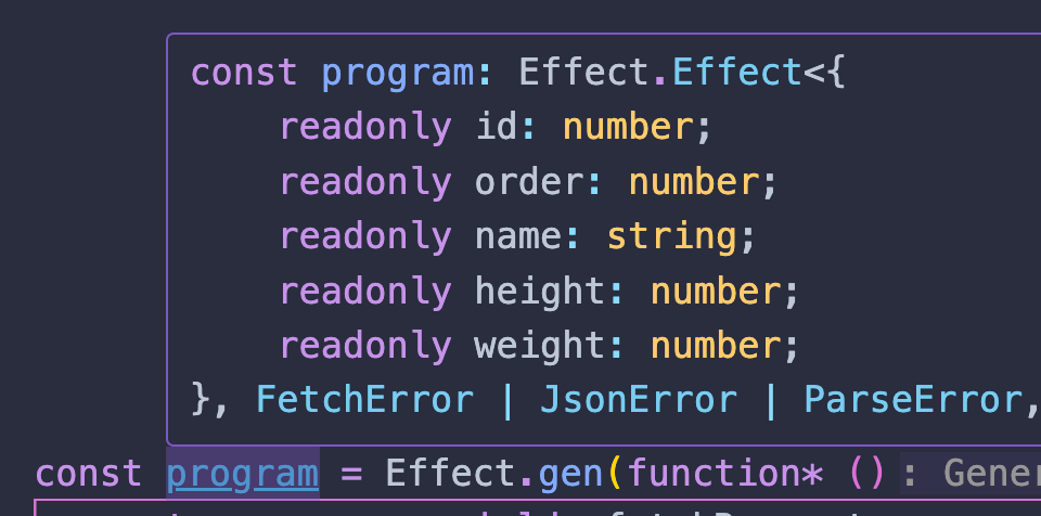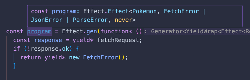If you inspect the success type of program in your IDE you actually don't see Pokemon but instead an object with the properties we defined inside Pokemon.